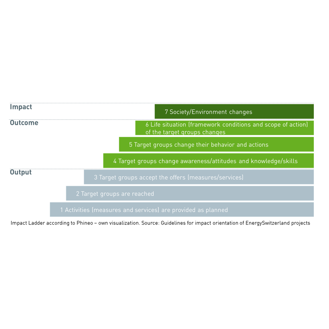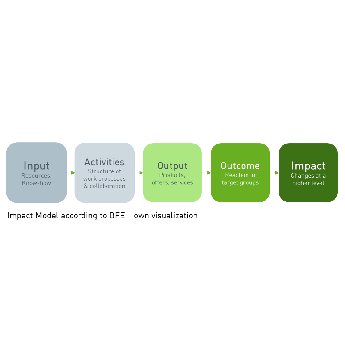To establish a shared understanding of the project goals, we developed a logic model based on a workshop and in accordance with the BFE’s guidelines on impact orientation. The model distinguishes between outputs, outcomes, and impacts (see graphic below). It ensured that all inputs and activities were aligned with the project objectives—especially the desired outcome: behavioral change within the target group.